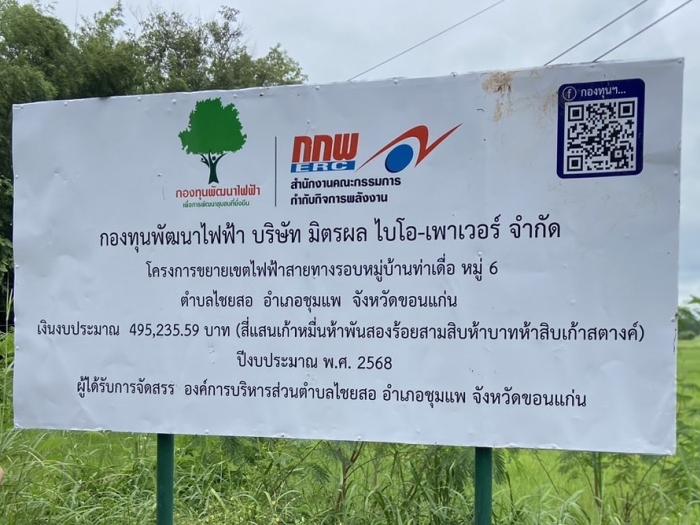 งบกองทุนพัฒนาไฟฟ้า บริษัท มิตรผล ไบโอ-เพาเวอร์ จำกัด ขยายเขตไฟฟ้า สายทางรอบหมู่บ้านท่าเดื่อ หมู่ 6 ตำบลไชยสอ อำเภอชุมแพ จังหวัดขอนแก่น ชาวบ้านอุ่นใจ แสงสว่างรอบชุมชน
